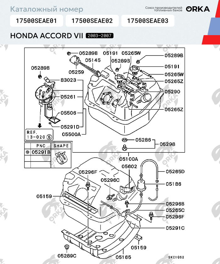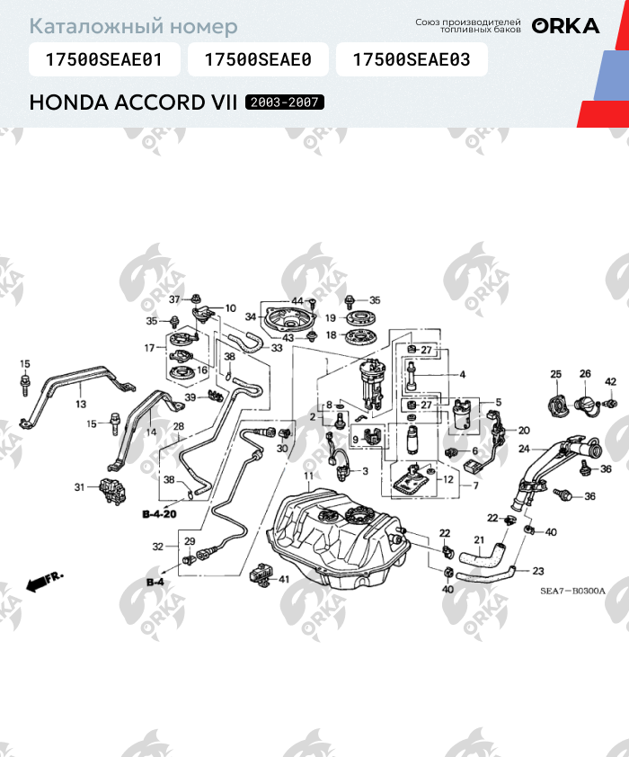 Пластиковый Топливный бак Honda Accord VII, 2003 - 2007 г.в. (NB) (Хонда Аккорд 7) каталожный номер 17500SEAE01, 17500SEAE02, 17500SEAE03 изготовлен по методике цельного литья. Цельно литые баки в отличие от составных не имеют протечек, а значит существенно ниже риск течи топлива. Толщина стенки бака составляет 10 миллиметров, что в свою очередь дает более крепкую конструкцию в целом и надежность при ударах. Бак полностью соответствую оригинальным заводским бакам - форма, размер, расположение технологических отверстий и пазов для креплений! Замена старого бака на новый пройдет без всяких проблем. Внутри бензобака установлены перегородки по заводским чертежам, чтобы избежать неравномерного распределения топлива. Снаружи бака уложены медные трубки для подключения топливной магистрали, а также воздуха. Бак прошёл официальную сертификацию по стандартами ГОСТ Российской Федерации!